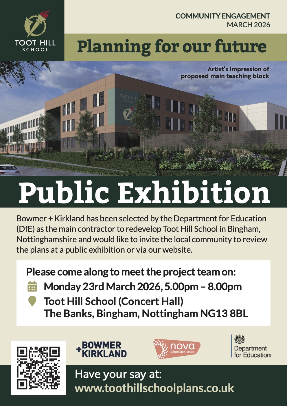 Bowmer + Kirkland are holding a public exhibition to review the plans for the redevelopment of Toot Hill School. The exhibition will be held on Monday the 23rd of March, from 5pm until 8pm, in the Toot Hill Concert Hall. More information is in the documents below.
